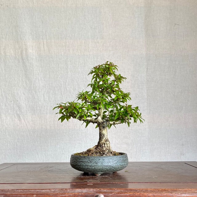 繊細な枝ぶりと小さな葉が美しい、ニレケヤキのミニ盆栽。自然の中にある樹木の姿をそのまま縮めたような、風格ある佇まいが魅力です。手のひらに収まるサイズながら、しっかりとした幹と広がる枝葉に、木の生命力を感じることができます。 季節によって葉の色が移ろい、春の新芽、夏の青葉、秋の紅葉、冬の落葉と、一年を通して表情が変わるのも楽しみのひとつ。静かに時を重ねるこの盆栽は、見る人の心にそっと寄り添い、暮らしの中に豊かな自然のリズムをもたらしてくれます。 シンプルな空間にも、和洋問わず溶け込むデザインで、贈り物やインテリアグリーンとしてもおすすめの一鉢です。 育て方 ・置き場所 日当たりと風通しの良い屋外で育てるのが理想です。特に春から秋にかけては十分な日光を浴びせることで、紅葉をより美しくさせます。夏の強い日差しには注意し、半日陰に移動するか遮光してください。冬は落葉後、寒風と霜を避けた場所で管理します。 ・水やり 表土が乾いたら、鉢底から水が流れるまでたっぷりと与えます。葉が生い茂る夏場は乾きやすくなるため、朝晩2回の水やりが必要な場合もあります。冬場は乾燥具合を見ながら、控えめに与えてください。 ・剪定 春〜秋に伸びた枝は、樹形を整えるためにこまめに剪定します。枝の分かれ目を意識して切ることで、美しいシルエットが保てます。冬は落葉しているため剪定の好機です。 ・肥料 春と秋に固形の緩効性肥料を施すと、枝葉の育成が促されます。真夏と冬は肥料を控えてください。 ,その他のお手入れ 落ち葉や枯葉はこまめに取り除き、通風を確保しましょう。葉が小さいため、病害虫の兆候も見えやすく、早めの対処が大切です。 ご購入後、育て方やご不明な点についてはメールやInstagramのDM等でフォローアップさせて頂きます。 商品写真は2025/05/03のものであり、現状と異なる場合があります。 現状確認が必要な場合はお問合せください。